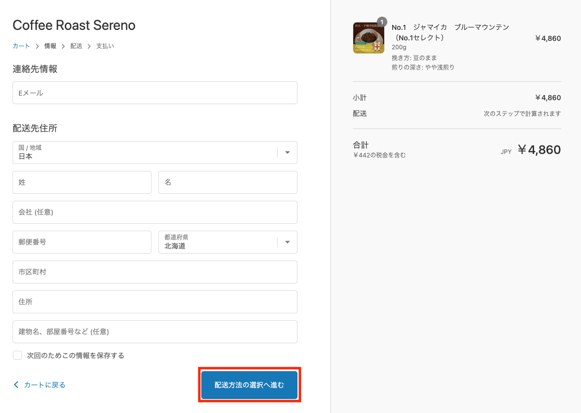 1.購入商品が決定した場合「連絡先情報等の画面」に必要事項を記載し「配送方法の選択に進む」をクリックします。