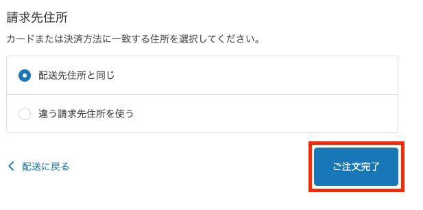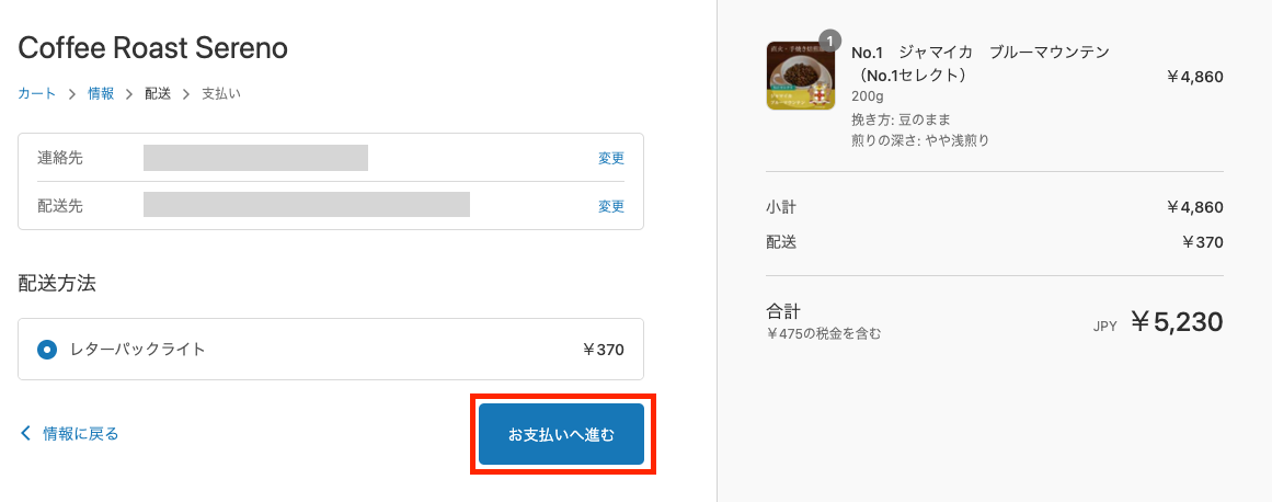 2.「連絡先・配送方法等」をご確認の上「お支払いへ進む」をクリックします。
